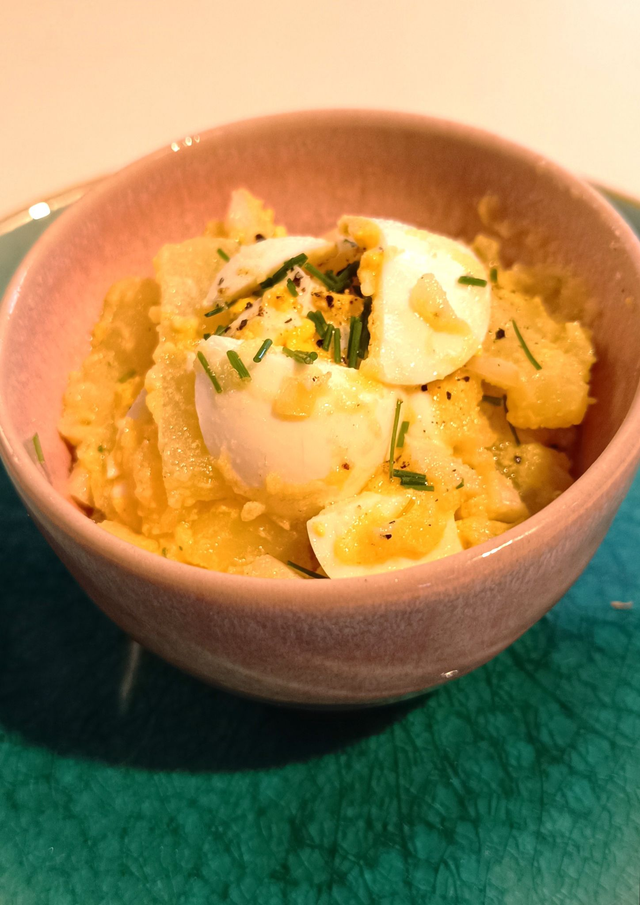 Une salade rustique et savoureuse, composée de pommes de terre fondantes, d’œufs durs, d'oignons et d’une sauce maison à base de moutarde. Parfaite en entrée ou en accompagnement, elle séduit par son authenticité et sa générosité.