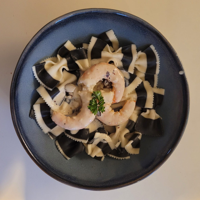 Crevettes curry vert / Pâtes à l'encre de seiche